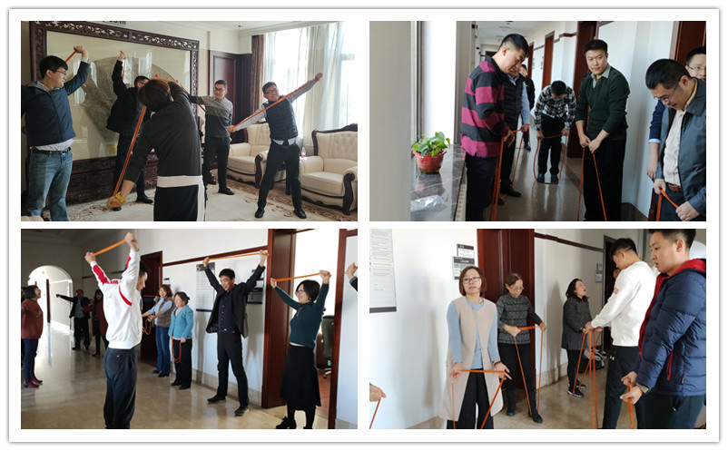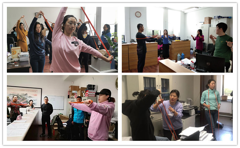 前期,体教部党总支结合“不忘初心、牢记使命”主题教育调研过程中教师们提出的健身指导问题,制定了深入机关、各院系指导健身的解决方案。其次,充分发挥体教部教师的专业优势,选择了适合办公室健身的弹力带,编排了具体的健身动作,并开展体教部党员教师集中培训。同时,体教部组织专业教师录制了办公室健身操视频,更好更科学更长期的指导教师们开展健身。