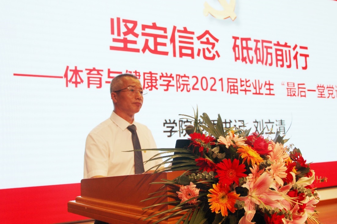 刘立清以《坚定信仰 砥砺前行》为题讲授党课,对党员同志提出期望和要求。一是坚定信念,对党忠诚,锤炼党性修养,增强政治意识,始终做到信念如磐、使命在肩;二是增强本领,实践锻炼,坚持拓展学习广度和深度,在实践中加强锻炼,增强内涵素养和发展潜力;三是牢记宗旨,严以律己,始终牢记为人民服务的宗旨,坚持从严律己,将自己的小我融入祖国的大我、人民的大我之中,与时代同步伐、与人民共命运。同时勉励毕业生党员始终铭记党员身份,牢记党员使命,在未来工作学习生活中发挥“领头雁”作用,做新时代的奋斗者。