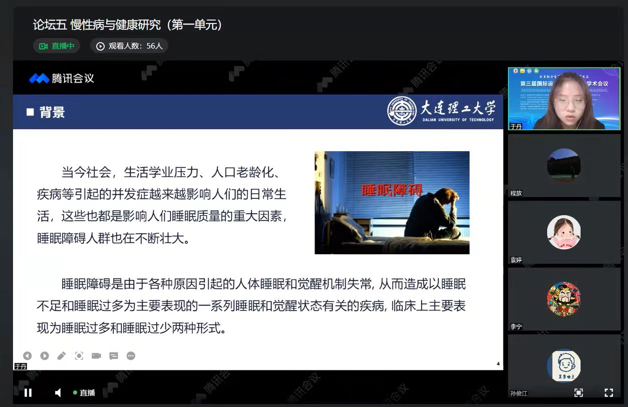 11月12日上午,我院研究生于丹在慢性病与健康研究分论坛做专题报告并与参会人员就研究内容进行探讨交流。报告以《不同形式运动对睡眠障碍患者睡眠质量影响的Meta分析》为题,探讨了不同运动周期、运动频率和运动强度对睡眠质量的改善效果,旨在提供可以改善睡眠质量的合理运动形式,为减少人们的睡眠障碍问题、提高睡眠质量、培养健康的生活方式提供参考。
